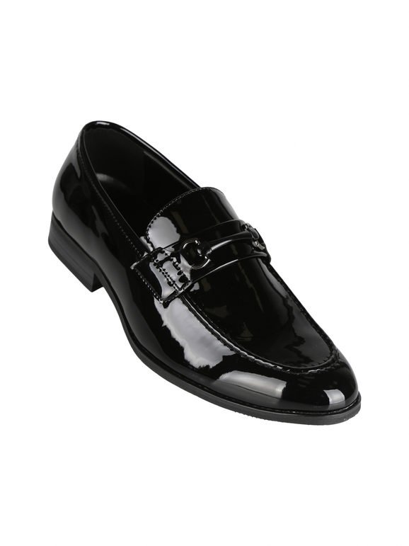 Un mocasín elegante de charol negro, diseñado para quienes buscan comodidad sin perder sofisticación. Su acabado brillante y el detalle metálico en el empeine aportan un toque distintivo, ideal para eventos formales, cenas elegantes o reuniones especiales. Con su suela resistente y estilo versátil, es la opción perfecta para combinar con trajes o conjuntos de gala.